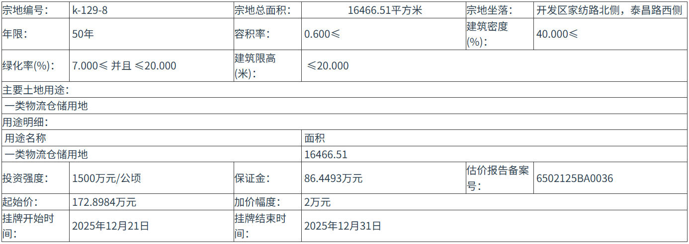 k-129-8 號(hào)地塊:2025年12月21日 10時(shí)00分 至 2025年12月31日 12時(shí)00分;