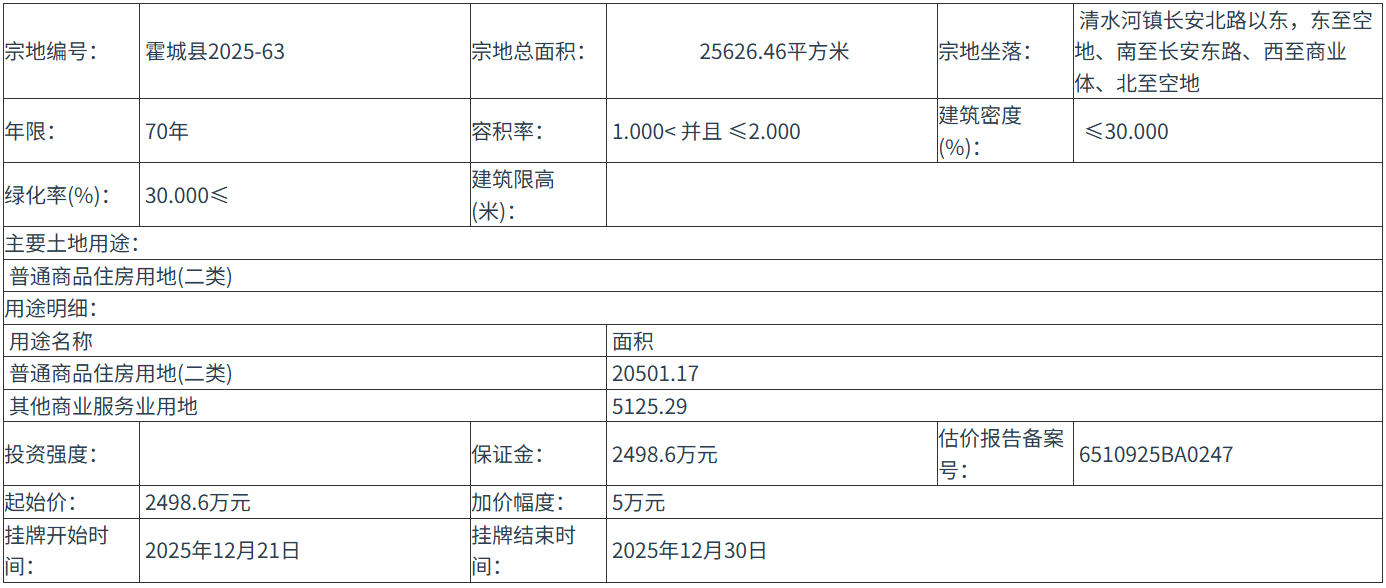 霍城縣2025-63 號(hào)地塊:2025年12月21日 10時(shí)00分 至 2025年12月30日 12時(shí)00分;