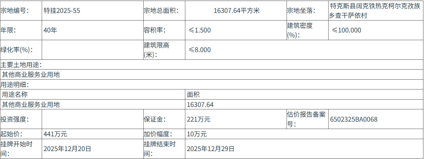 四、 本次掛牌出讓的詳細(xì)資料和具體要求,見(jiàn)掛牌出讓文件。申請(qǐng)人可于 2025年12月01日 至 2025年12月20日 到 特克斯縣自然資源局土地儲(chǔ)備交易中心 獲取 掛牌出讓 文件。