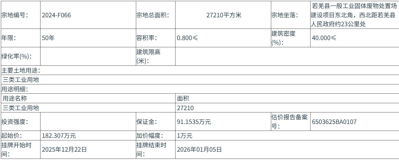四、 本次掛牌出讓的詳細(xì)資料和具體要求,見(jiàn)掛牌出讓文件。申請(qǐng)人可于 2025年12月02日 至 2025年12月21日 到 巴州公共資源交易網(wǎng)(http://xjbzggzy.cn/) 獲取 掛牌出讓 文件。