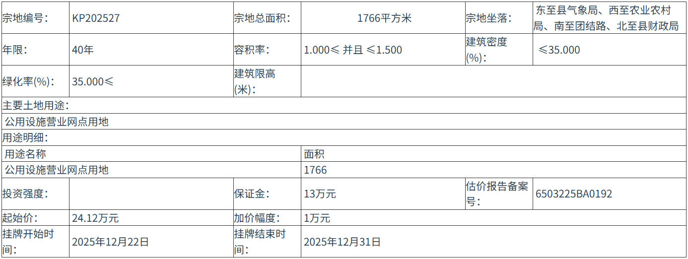 KP202527 號(hào)地塊:2025年12月22日 12時(shí)00分 至 2025年12月31日 12時(shí)00分;