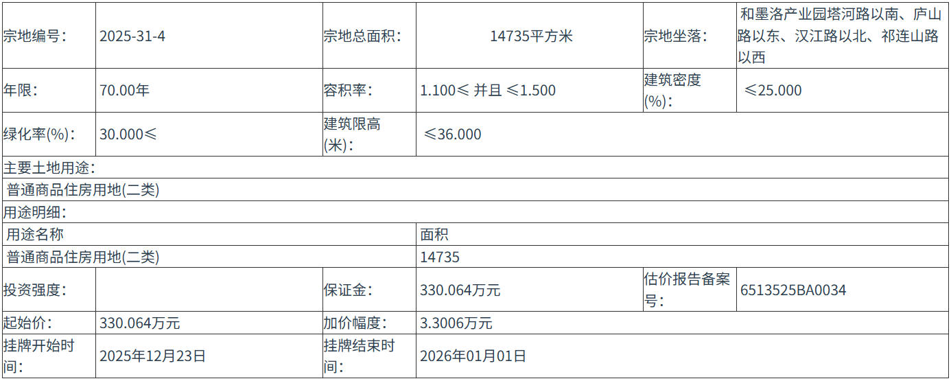 四、 本次掛牌出讓的詳細資料和具體要求,見掛牌出讓文件。申請人可于 2025年12月01日 至 2025年12月22日 到 第十四師昆玉市自然資源和規(guī)劃局 獲取 掛牌出讓 文件。