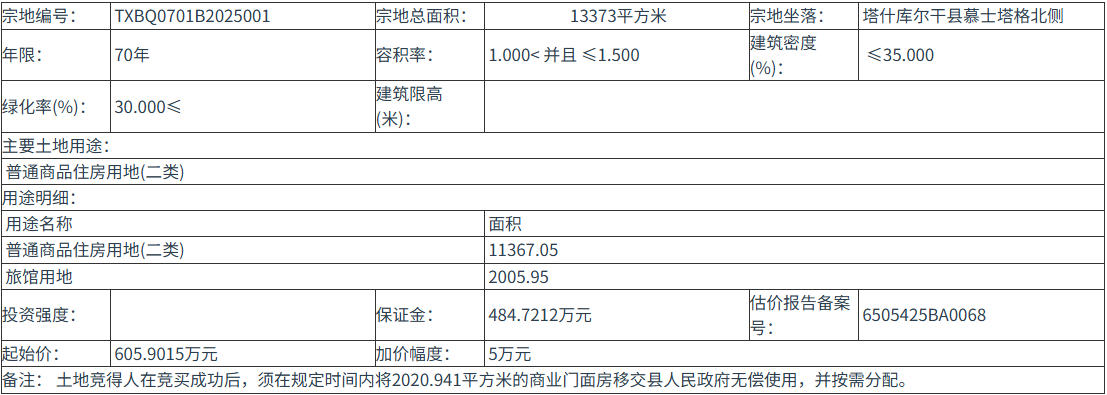 經(jīng)塔什庫(kù)爾干塔吉克自治縣人民政府批準(zhǔn),塔什庫(kù)爾干縣自然資源局決定以 拍賣(mài)出讓 方式 1(幅) 地塊的國(guó)有土地使用權(quán)?,F(xiàn)將有關(guān)事項(xiàng)公告如下: