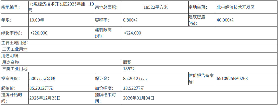 北屯經(jīng)濟(jì)技術(shù)開發(fā)區(qū)2025年掛—10號(hào) 號(hào)地塊:2025年12月23日 10時(shí)00分 至 2026年01月04日 17時(shí)30分;