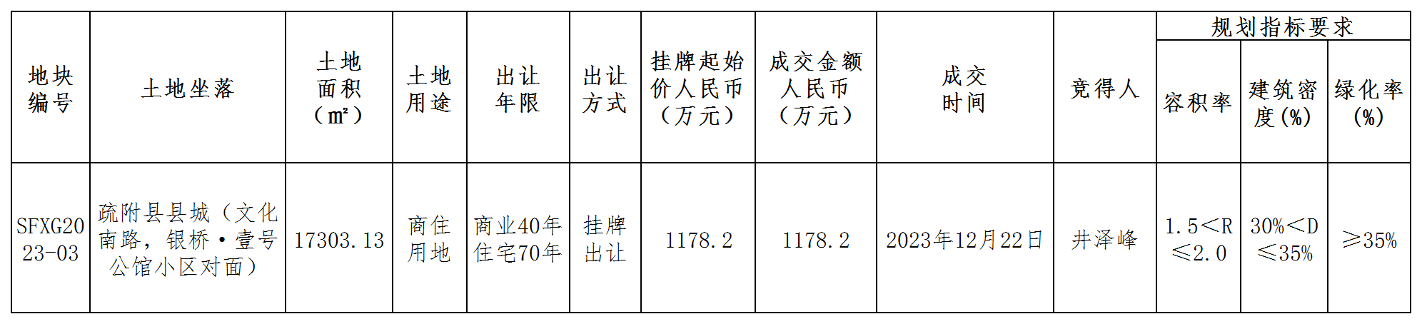 疏附縣自然資源局國(guó)有建設(shè)用地使用權(quán)成交結(jié)果公示(SFXCRCJ2023-8)