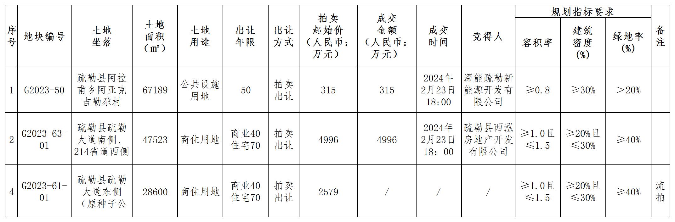 疏勒縣自然資源局國有建設用地使用權拍賣出讓成交結(jié)果公示(勒自然成字[2024]04號)