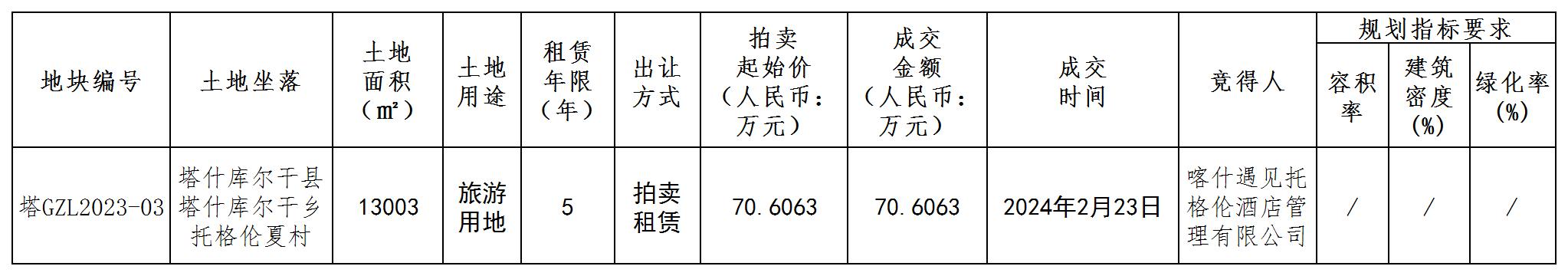 塔什庫(kù)爾干塔吉克自治縣自然資源局國(guó)有建設(shè)用地使用權(quán)拍賣租賃成交結(jié)果公示(塔自然資示[2024-21號(hào))