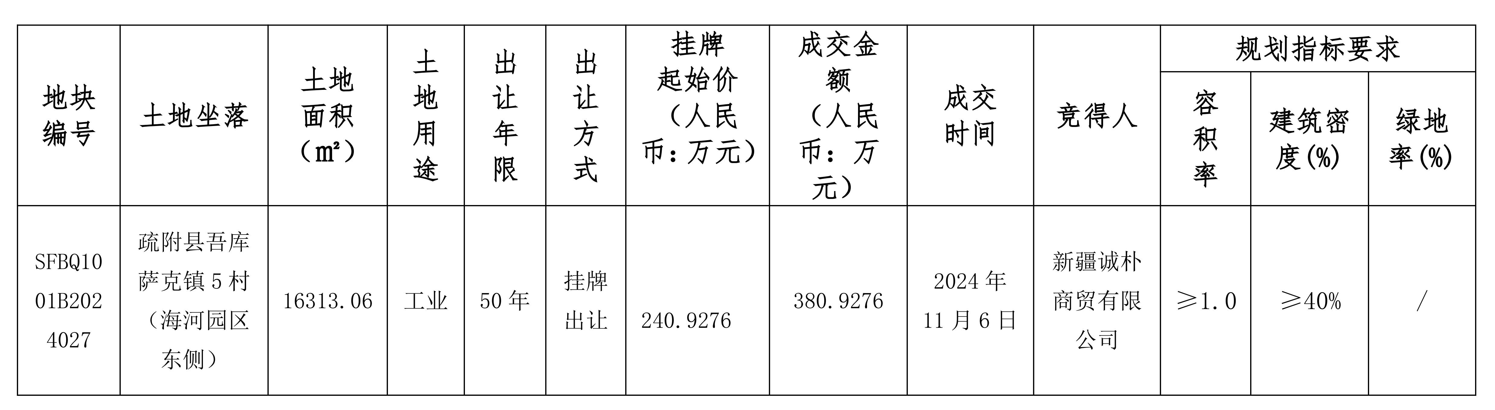 根據(jù)《中華人民共和國土地管理法》《招標(biāo)拍賣掛牌出讓國有建設(shè)用地使用權(quán)規(guī)定》(國土資源部令第39號)《自治區(qū)人民政府辦公廳轉(zhuǎn)發(fā)自治區(qū)發(fā)展改革委《自治區(qū)深化公共資源交易平臺整合共享工作方案》(新政辦函〔2019〕250號)等有關(guān)法律法規(guī)及文件的規(guī)定,疏附縣自然資源局以掛牌方式出讓1(幅)地塊的國有建設(shè)用地使用權(quán),現(xiàn)將出讓成交結(jié)果公示如下: