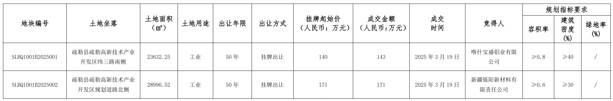 根據(jù)《中華人民共和國(guó)土地管理法》《招標(biāo)拍賣掛牌出讓國(guó)有建設(shè)用地使用權(quán)規(guī)定》(國(guó)土資源部令第39號(hào))、《自治區(qū)深化公共資源交易平臺(tái)整合共享工作方案〉的通知》(新政辦函〔2019〕250號(hào))等有關(guān)法律法規(guī)及文件的規(guī)定,疏勒縣自然資源局以掛牌方式出讓2(幅)地塊的國(guó)有建設(shè)用地使用權(quán),現(xiàn)將出讓成交結(jié)果公示如下: