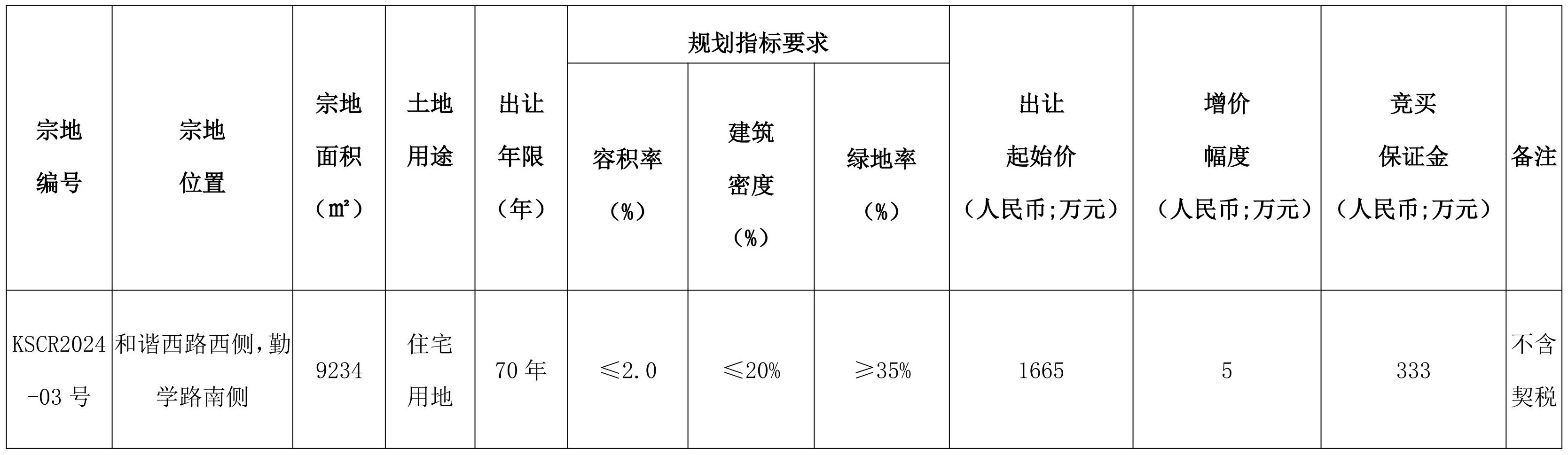 備注:另KSCR2024-03號宗地需配建新建住房總建筑面積不低于10%的比例配建保障性住房,保障性住房建筑面積原則上控制在60平方米內(nèi)。