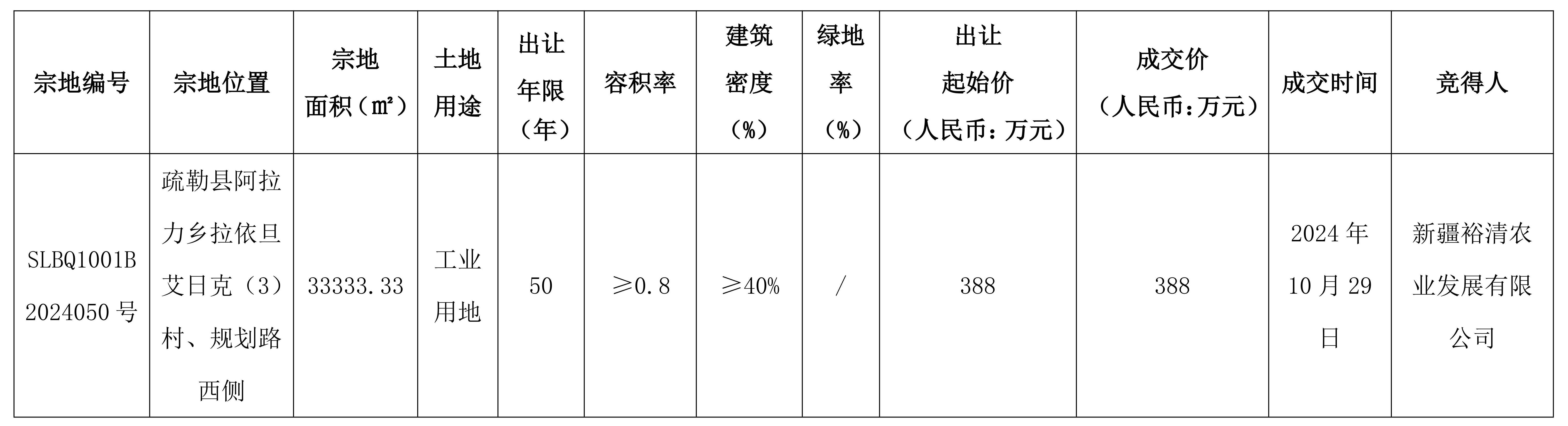根據(jù)《中華人民共和國土地管理法》《招標(biāo)拍賣掛牌出讓國有建設(shè)用地使用權(quán)規(guī)定》(國土資源部令第39號)《自治區(qū)深化公共資源交易平臺(tái)整合共享工作方案〉的通知》(新政辦函〔2019〕250號)等有關(guān)法律法規(guī)及文件的規(guī)定,疏勒縣自然資源局以掛牌方式出讓1(幅)地塊的國有建設(shè)用地使用權(quán),現(xiàn)將出讓成交結(jié)果公示如下: