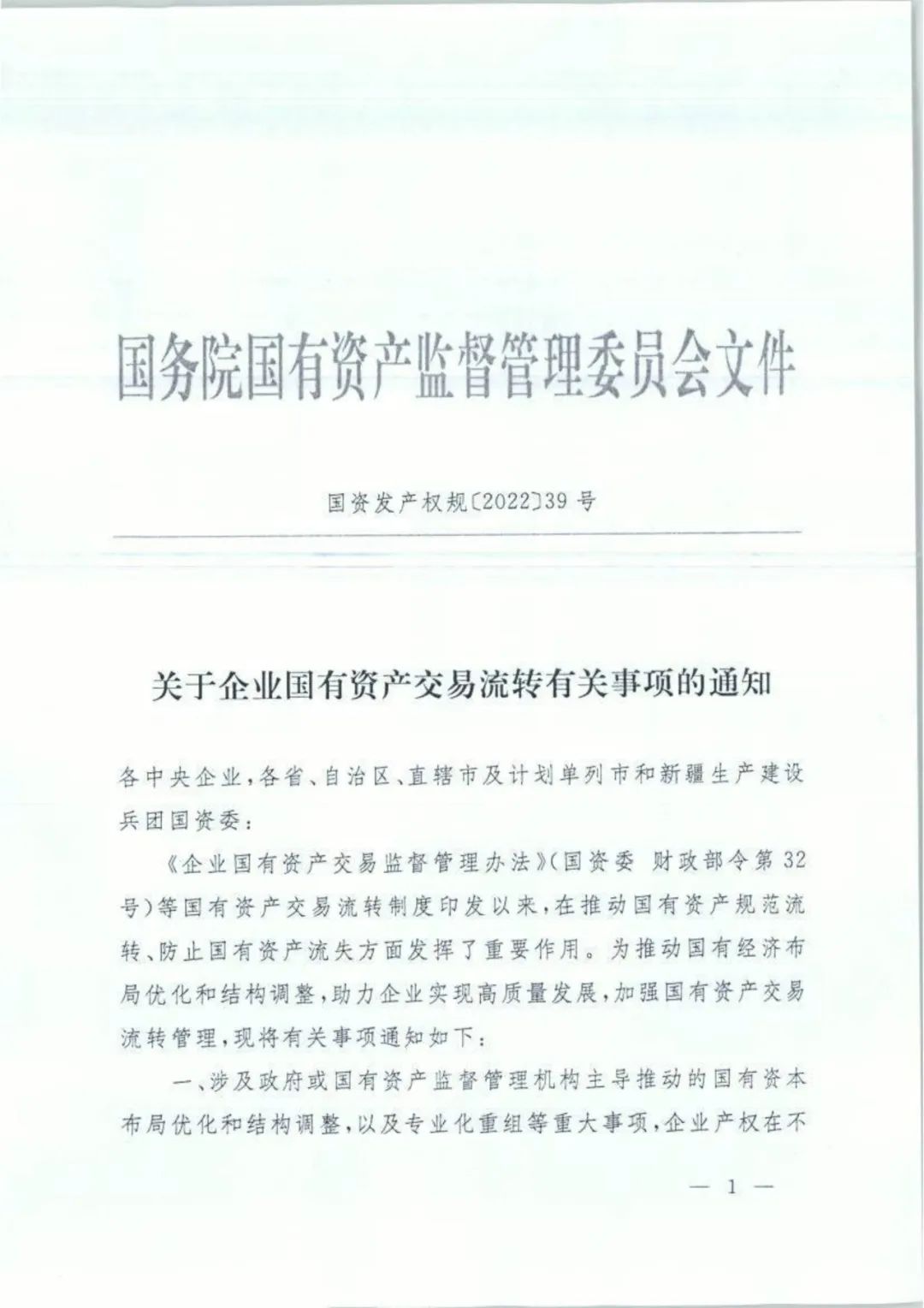 《企業(yè)國有資產(chǎn)交易監(jiān)督管理辦法》(國資委 財(cái)政部令第32號)等國有資產(chǎn)交易流轉(zhuǎn)制度印發(fā)以來,在推動(dòng)國有資產(chǎn)規(guī)范流轉(zhuǎn)、防止國有資產(chǎn)流失方面發(fā)揮了重要作用。為推動(dòng)國有經(jīng)濟(jì)布局優(yōu)化和結(jié)構(gòu)調(diào)整,助力企業(yè)實(shí)現(xiàn)高質(zhì)量發(fā)展,加強(qiáng)國有資產(chǎn)交易流轉(zhuǎn)管理,現(xiàn)將有關(guān)事項(xiàng)通知如下: