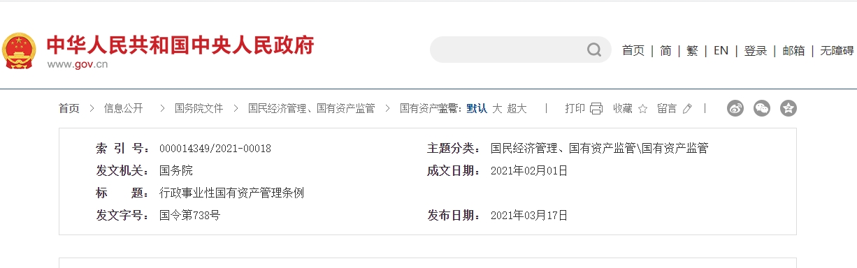 《行政事業(yè)性國有資產(chǎn)管理條例》已經(jīng)2020年12月30日國務院第120次常務會議通過,現(xiàn)予公布,自2021年4月1日起施行。