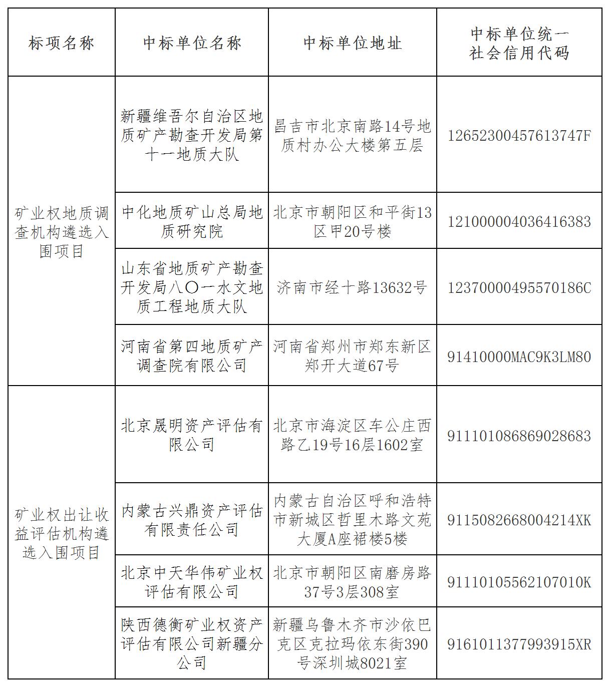 礦業(yè)權(quán)地質(zhì)調(diào)查機(jī)構(gòu)和出讓收益評(píng)估機(jī)構(gòu)遴選入圍項(xiàng)目公開招標(biāo)中標(biāo)結(jié)果公示