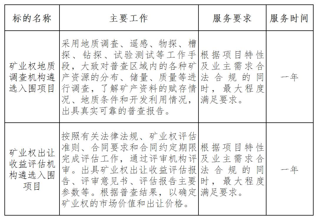 二、項(xiàng)目名稱:礦業(yè)權(quán)地質(zhì)調(diào)查機(jī)構(gòu)和出讓收益評(píng)估機(jī)構(gòu)遴選入圍項(xiàng)目