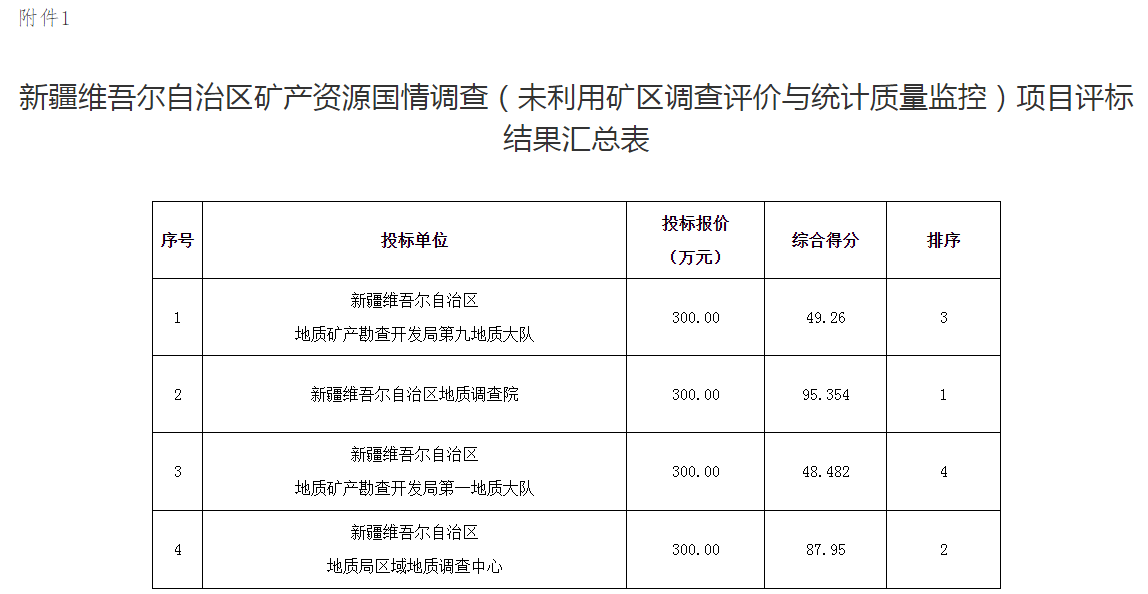 1.新疆維吾爾自治區(qū)礦產(chǎn)資源國情調(diào)查(未利用礦區(qū)調(diào)查評價與統(tǒng)計質(zhì)量監(jiān)控)項目評標(biāo)結(jié)果匯總表