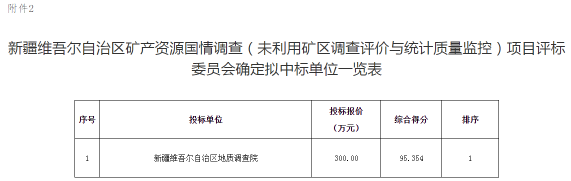 2.新疆維吾爾自治區(qū)礦產(chǎn)資源國情調(diào)查(未利用礦區(qū)調(diào)查評價與統(tǒng)計質(zhì)量監(jiān)控)項目評標(biāo)委員會確定擬中標(biāo)單位一覽表